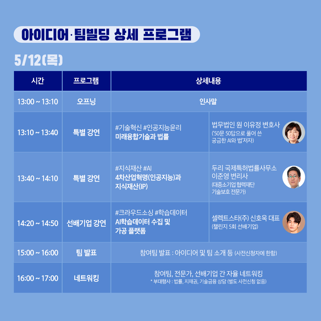 5. 행사 참여 : 5월 12일 목요일 13:00 ~ 17:00 (12:30까지 도착 요망)