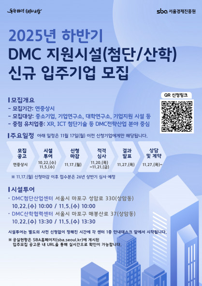 모집기간: 연중상시 모집대상: 중소기업, 기업연구소, 서울 소재 대학연구소, 기업 지원시설 등 중점 유치업종: XR, ICT 첨단기술 등 DMC전략산업 분야 중심